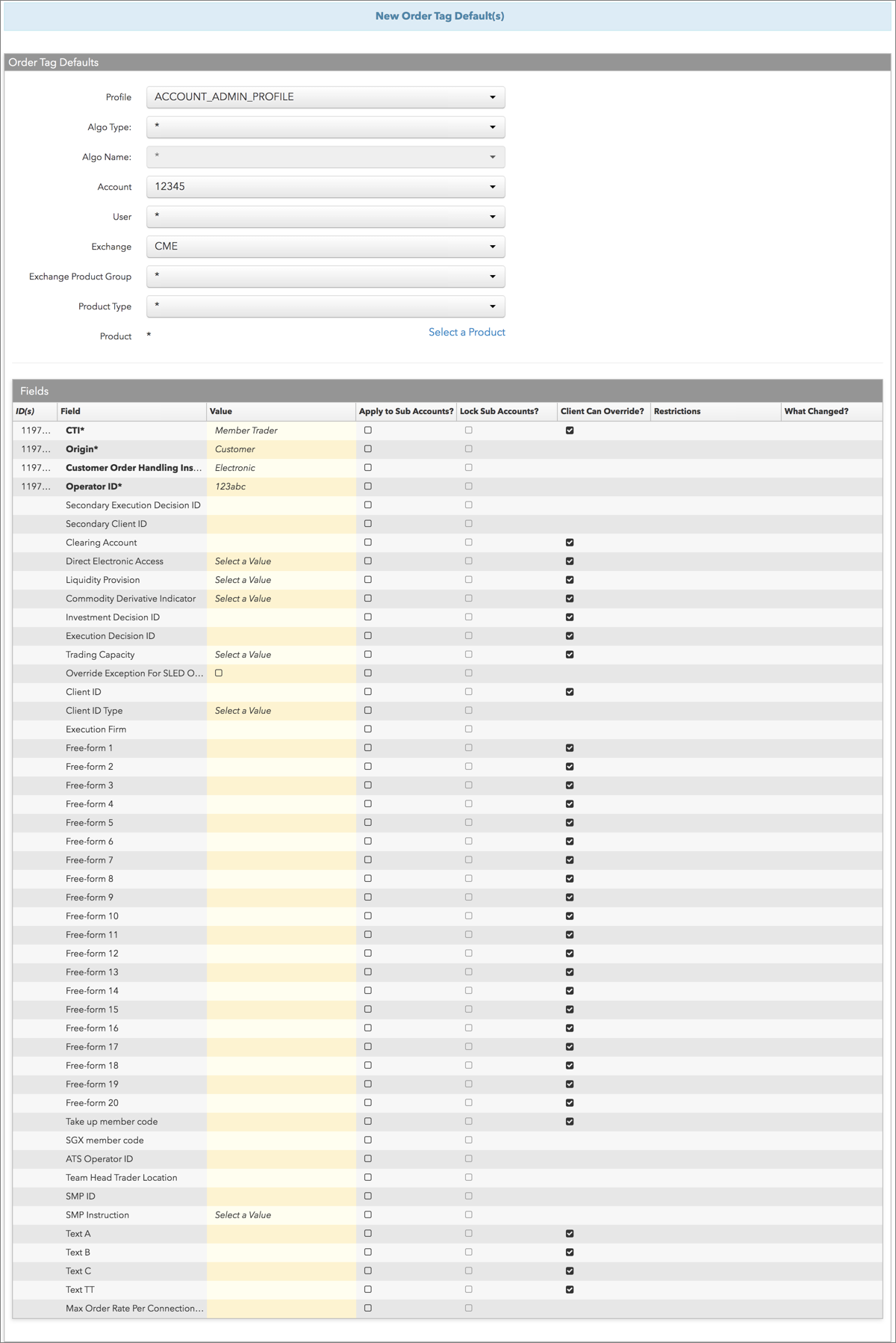 - Client Can Override: 取引アプリケーションや API から注文を発注する際に、この欄の値を指定変更できるかどうかを決定します。このチェックボックスを有効にして、欄のロックを解除し、ユーザーが値を指定変更できるようにします。チェックがオフの場合、欄はロックされていて、ユーザーは値を変更できません。