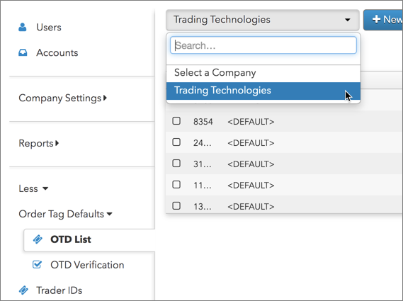 左ナビゲーション画面にて [More] - [Order Tag Defaults] - [OTD Verification] をクリックして、データ グリッドの上の [OTD Search] ボタンをクリックします。以下の重要な各欄 [Profile]、[Algo Type]、[Algo Name]、[Account]、[User]、[Product] に対し値を選択します。[Search] をクリックすると、検索条件に基づいて、注文に適用されるすべての既定の欄と値が、[Results] セクションに表示されます。