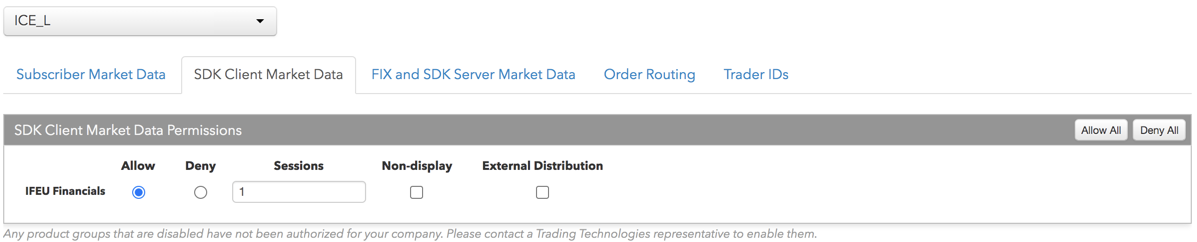 - [FIX and SDK Market Data] タブにより、TT .NET SDK Server Side とTT Cire SDK 取引アプリケーションを使って、マーケット データへのアクセスを許可または拒否できます。