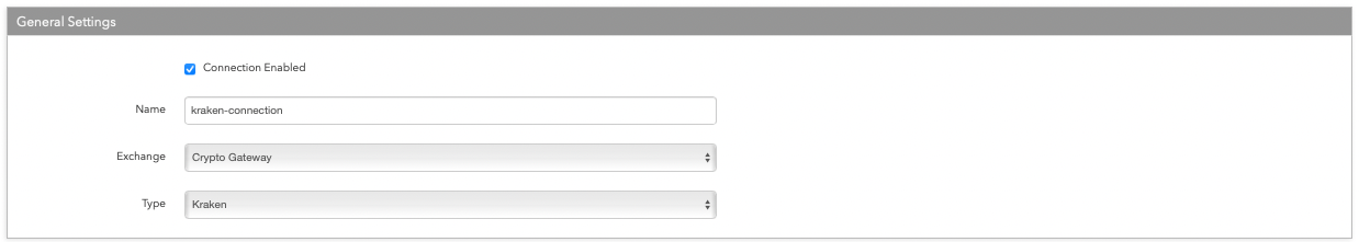 TT の Kraken への接続は、TT Crypto Gateway をつうじて送信されます。Kraken 接続をセットアップする際、[Exchange] 欄を [Crypto Gateway] に設定して、[Type] 欄を Krakenと同じにする必要があります。