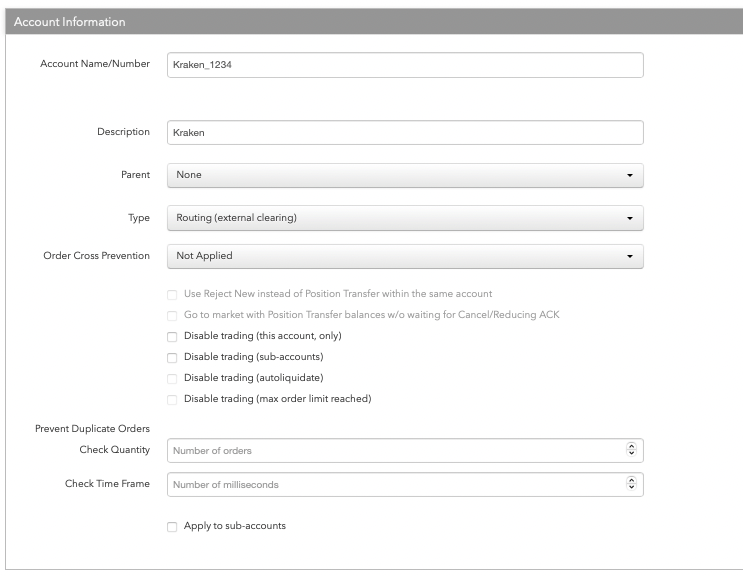 Routing (内部副口座): 取引所に送信されない副口座として、口座を定義します。これで、親口座が実際の清算口座や一括口座として取引所に送信されるとしても、送信目的とリスク目的のユーザーを内部口座に割り当てることができます。