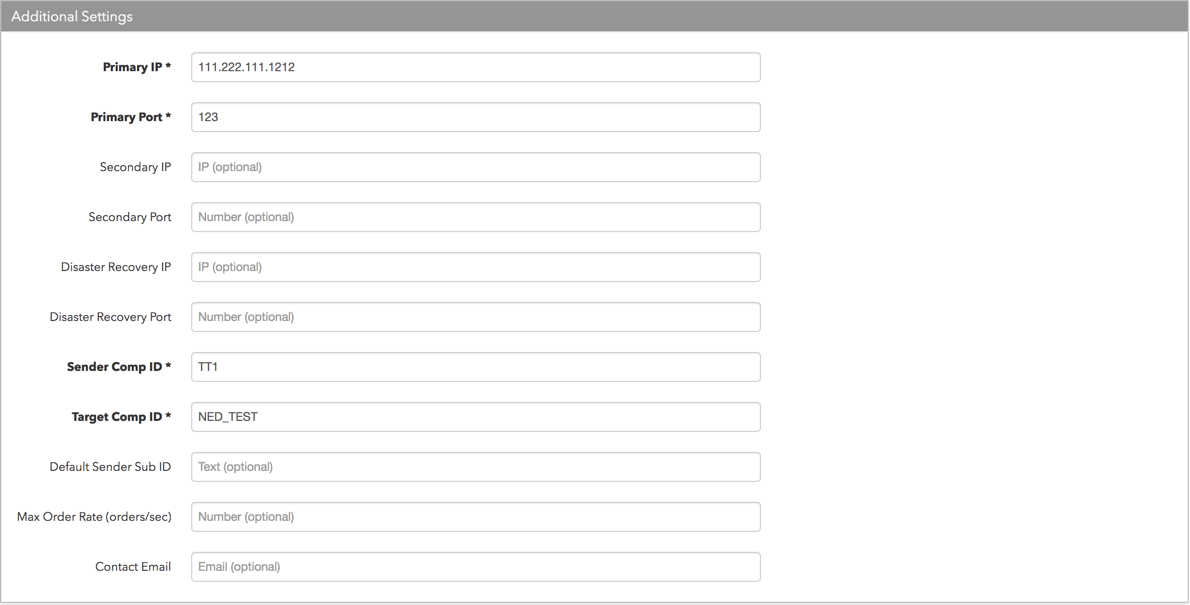 Max Order Rate (orders/sec): (オプション) ユーザーが1接続ごとに発注できる、最大注文数 (毎秒) を設定します。この限度は、取引所定義の注文率の最大を超過できません。[Additional Settings] (追加設定) セクションにてこの設定を行います。