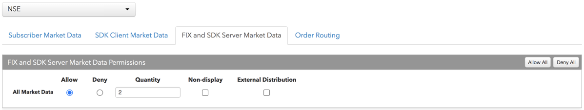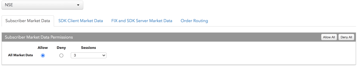 - [Subscriber Market Data] タブをクリックして、取引所で利用可能なすべてのマーケット データへのアクセスを許可または拒否できます。