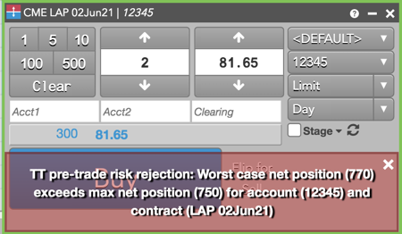 回答: 注文は拒否されます。「最大注文枚数」がリスク チェックを通過しても (枚数 × numberOfBlocks = 2 × 35 = 70 < 100)、LAP 02Jun21 の結果のポジション ((20 × 35) + (2 × 35) = 770) は、LAP 限月の 750 のポジション限度を超過しています。トレーダーは TT ワークスペースで以下のエラー メッセージを受信します。