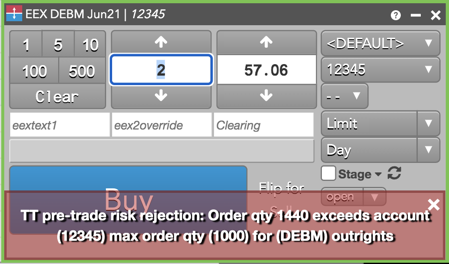 回答: 注文は拒否されます。EEX の DEBM Jun21 限月に対しフローでリスクが計算されます。注文枚数 × numberOfBlocks = 2×720。DEBM Jun21 の2限月の枚数は 1440 ロットに等しい枚数です。これは Setup の 1000 の最大注文枚数を超過しています。トレーダーは TT ワークスペースで以下のエラー メッセージを受信します。