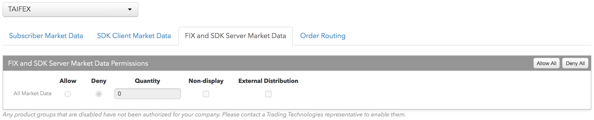 - [FIX and SDK Server Market Data] タブをクリックして、TT FIX、TT .NET SDK Server Side、TT Core SDK 取引アプリケーションに対して取引所で利用可能なマーケット データ グループへのアクセスを許可または拒否できます。