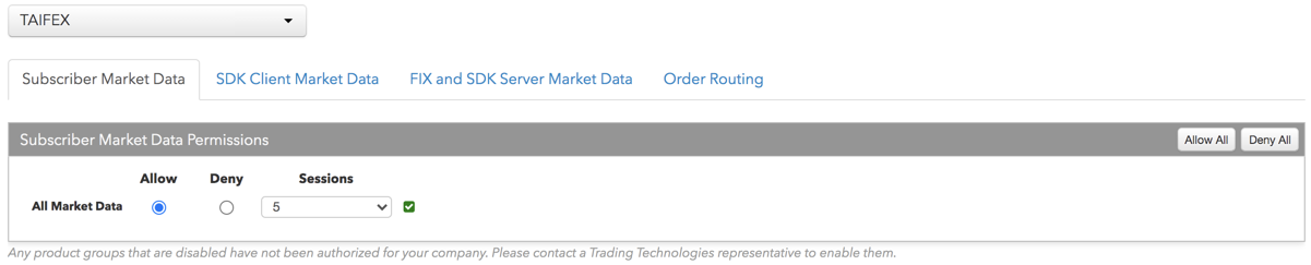 注: TAIFEX ユーザーの 注文ルーティングパラメータは FIX Order Gateway で設定されます。ただし、TAIFEX マーケット データは、[TAIFEX] → [Subscriber Market Data] タブを使って、TAIFEX のネイティブ サポートされている価格フィードでユーザーに対し有効化されます。