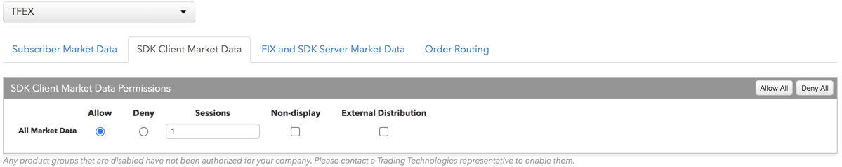 - [FIX and SDK Market Data] タブにより、TT .NET SDK Server Side とTT Cire SDK 取引アプリケーションを使って、マーケット データへのアクセスを許可または拒否できます。